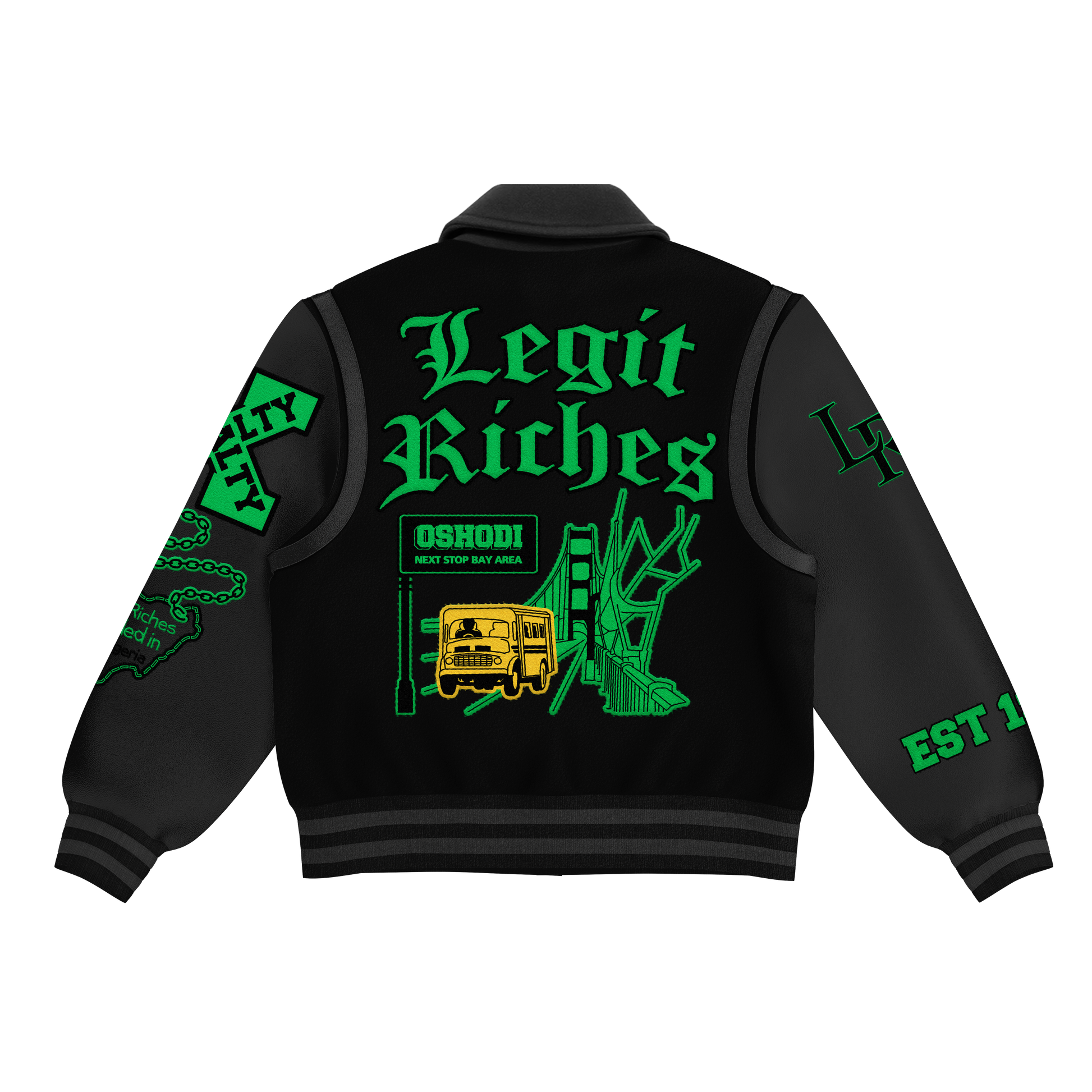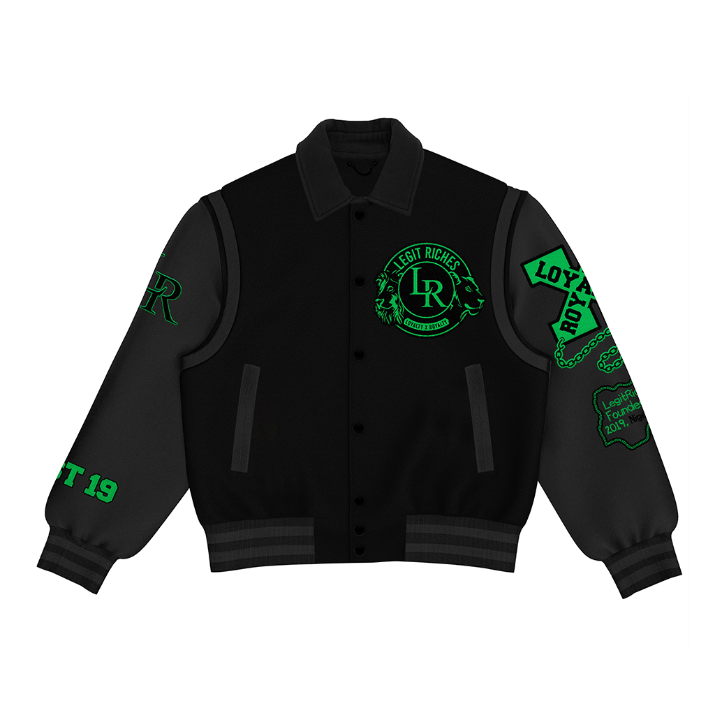Wool blend with cow-hide leather fill and quilted satin linen. Snap front closure with welt leather hand pockets at lower front and interior chest pockets. Embroidery logo panel on front and back. Original artwork by Legit Riches