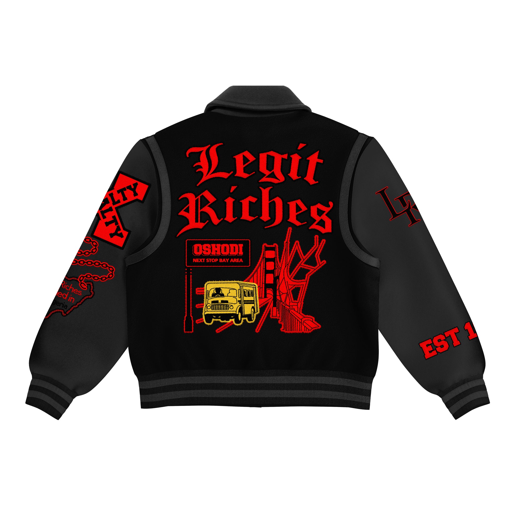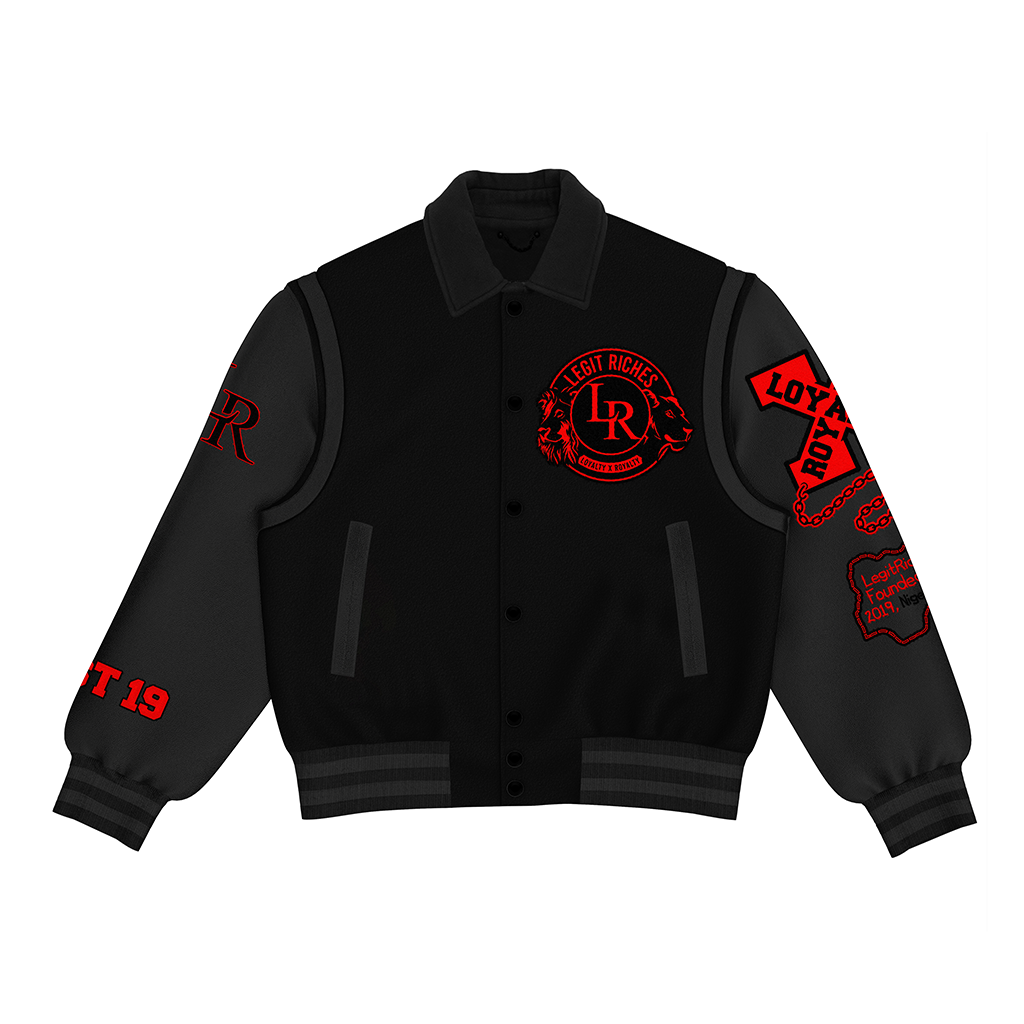 Wool blend with cow-hide leather fill and quilted satin linen. Snap front closure with welt leather hand pockets at lower front and interior chest pockets. Embroidery logo panel on front and back. Original artwork by Legit Riches